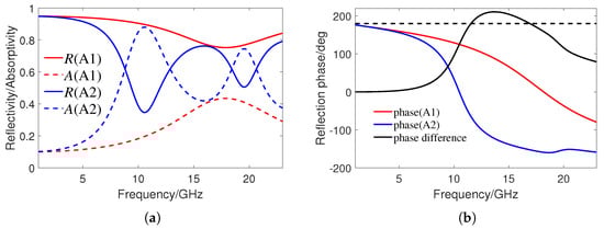 Figure 4a shows the reflectivity and absorptivity of the two units A1 and A2, while Figure 4b shows their corresponding reflection phases and their phase difference. The reflectivity is calculated by and the absorptivity is . It can be seen that both A1 and A2 have a certain absorption effect, where A1 generates a resonance point with a maximum absorption rate of 43% at 18.2 GHz, and A2 has two resonance points with a maximum absorption rate of 88% at 10.5 GHz. The phase difference between A1 and A2 at 11.6 GHz and 16.9 GHz is close to 180°, so it is expected to generate two reflection reduction peaks.