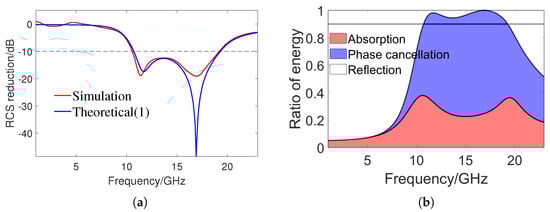 Under normal incidence, Figure 5a shows the RCS reduction obtained by a full-wave simulation and the approximate RCS reduction obtained by substituting the reflection coefficient and phase into (1). The full-wave simulation is calculated using the time domain solver of CST. The excitation source is a Gaussian pulse, and the RCS results in a wide frequency band are obtained through a time–frequency conversion. The time domain solver uses hexahedral meshes for spatial discretization, which cannot perfectly fit the geometric characteristics of the metasurface. Therefore, there are also certain errors in the simulation results. The metasurface is placed in the plane, and the angles between the incident wave direction with the z-axis and x-axis are and , respectively. The backscattering of the metasurface and the PEC surface with the same size is simulated, respectively, and the RCS reduction of the metasurface is obtained by subtracting the two results. It can be seen that the full-wave simulation results are basically consistent with the theoretical results obtained by (1). Considering the numerical error in the full-wave simulation, the difference between the two results is acceptable. The simulated RCS has a reduction of over 10 dB in the bandwidth of 10.6–19.4 GHz, with a relative bandwidth of 58.6%. As predicted, there are two RCS reduction peaks, reaching 18.9 dB and 19.1 dB at 11.8 GHz and 16.8 GHz, respectively. Figure 5b shows the energy distribution ratio of the proposed checkerboard metasurface under normal incidence, where the energy ratio of absorption , phase cancellation , and reflection are calculated as follows: