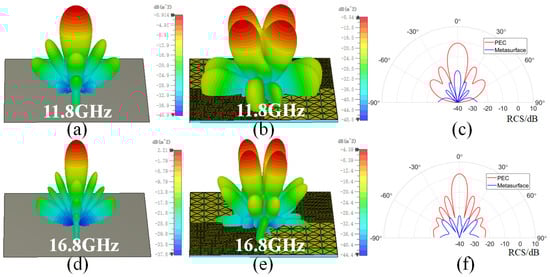 The 3D scattering patterns of the PEC surface and the checkerboard metasurface, as well as the corresponding bistatic RCS in the plane at different frequencies. (a–c) 11.8 GHz. (d–f) 16.8 GHz.