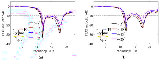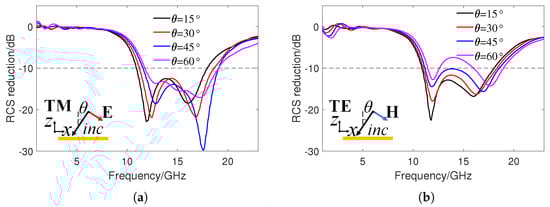 Simulated RCS reduction in specular direction of the checkerboard metasurface under different incident angles and polarizations. (a) TM polarization. (b) TE polarization.