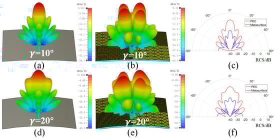 The 3D scattering patterns of the PEC surface and the checkerboard metasurface, as well as the corresponding bistatic RCS in the plane at different curvature angles. (a–c) = . (d–f) = .
