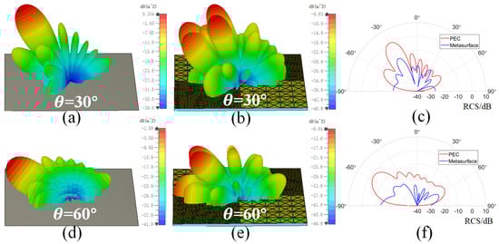The 3D scattering patterns of the PEC surface and the checkerboard metasurface, as well as the corresponding bistatic RCS in the plane at different oblique incidence angles. (a–c) = . (d–f) = .