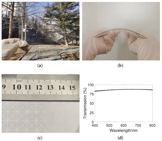 (a) Photograph of the fabricated sample showing optical transparency and (b) photograph of the fabricated sample showing flexibility. (c) Magnified photograph image of the fabricated sample. (d) The transmittance of the sample measured in the visible light wavelength range.