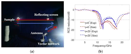 (a) Measurement setup in the anechoic chamber. (b) Simulated and measured RCS reduction at and under normal incidence.