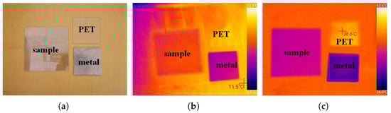 The IR stealth ability of the proposed metasurface was tested through IR imaging. We imaged the fabricated sample using a thermal IR camera (Thermoview T72) (Huashengchang, Shenzhen, China) operating at the wavelength of 7.5–14 m and compared the results with the IR imaging of a metal plate and a PET plate. Figure 13a shows the image of the three samples. Figure 13b is the IR image at a room temperature of 25 °C, and Figure 13c is the IR image of the three samples after being heated on a 50 °C heating plate for ten minutes. The higher the temperature displayed in the IR image, the stronger the IR radiation of the object. It can be found that the IR radiation of the checkerboard metasurface is higher than the metal plate, but is significantly lower than PET, which confirms the good IR stealth performance of the metasurface. Based on the imaging results, it can be estimated that the IR emissivity of the checkerboard metasurface is as follows [39]: