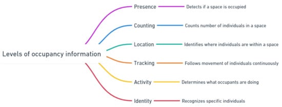The authors introduced a three-dimensional concept of presence. These dimensions include occupant resolution, spatial resolution, and temporal resolution. When it comes to determining the presence of people, higher resolution is directly related to improved accuracy and a more comprehensive understanding of both occupancy and the activities of the occupants. This multi-dimensional approach provides a comprehensive framework to analyze and interpret occupancy data, allowing for a more nuanced understanding of how spaces are utilized over time and across different locations. Different applications require different levels of occupancy information because of their spatial and temporal properties [23,24]. Based on previous research, we have suggested an updated categorization of occupancy levels in smart buildings, as shown in Figure 2. This new classification includes the fundamental aspects of presence, counting, location, tracking, activity, and identity. The richness of information in the categorization of occupancy levels in smart buildings typically increases as we move down from presence to identity. However, the relevance and utilization of each level of occupancy data depend significantly on the specific application, with certain levels being more critical than others for achieving desired outcomes.