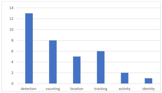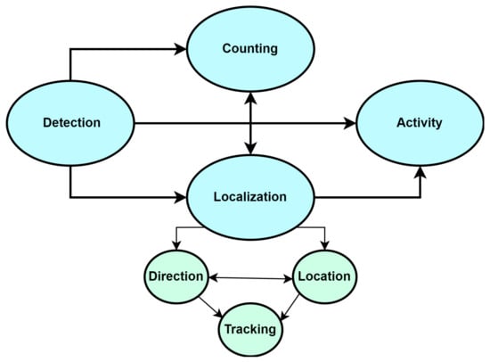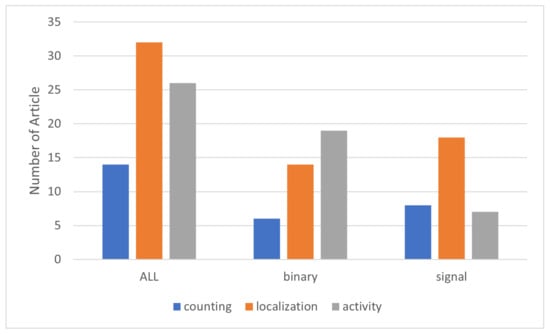 In our literature review, we have organized the articles into three main categories based on the level of occupancy information: people counting, localization (which encompasses direction, location, and tracking), and activity detection, as illustrated in Figure 4.