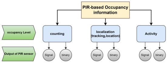 While some of the previous literature reviews mention PIR sensors, most of them consider these sensors in combination with others, focusing on sensor fusion [22,26]. These reviews typically restrict the use of PIR sensors to mere detection, ignoring their potential to capture other levels of occupancy information, such as activity. Moreover, we observe a notable gap in the existing literature: there is a lack of comprehensive reviews that consider the integration of occupancy information with machine learning techniques in conjunction with PIR sensors. Although these reviews often compare PIR sensors with different sensor types, they do not specifically address the application of machine learning to different levels of occupancy information based on PIR sensors. Additionally, while they do not look at and differentiate signal-based and binary PIR sensors for different levels of occupancy information, key aspects such as the spatial resolution of binary and signal-based PIR sensors and the influence of sensor placement are neglected. Consequently, this literature review is specifically dedicated to investigating the application of PIR sensors in people counting, localization (including tracking and location determination), and activity detection. Importantly, we focus on the impact of machine learning algorithms and various data processing techniques applied to PIR sensors, encompassing both binary and signal-based types. We explore the scope and application of PIR sensors in various settings, such as buildings and individual rooms. Furthermore, we analyze the reliability of PIR sensors for accurately capturing occupancy data. This involves evaluating factors such as sensor placement and determining the appropriate number of both binary and signal-based PIR sensors required for different levels of occupancy information. This comprehensive review aims not only to understand the current state of PIR sensor technology but also to provide insights into optimizing their effectiveness in diverse environments.