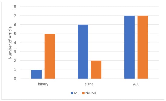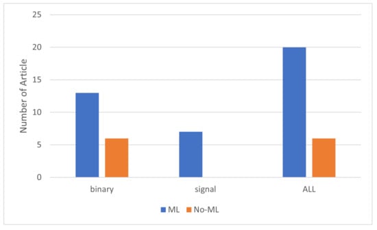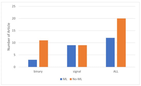 Additionally, we found that PIR sensors are widely used in activity detection, noting their significant use in both binary and signal-based sensors. As Figure 9 shows, 20 articles on the use of PIR sensors for activity detection employ machine learning algorithms: all of the articles on signal-based PIR sensors and two-thirds of the ones on binary PIR sensors.