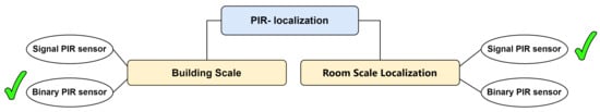- Lai, K.C.; Ku, B.H.; Wen, C.Y. Using cooperative PIR sensing for human indoor localization. In Proceedings of the 2018 27th Wireless and Optical Communication Conference (WOCC), Hualien, Taiwan, 30 April–1 May 2018; IEEE: Piscataway, NJ, USA, 2018; pp. 1–5. [Google Scholar]