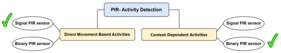 - Luo, X.; Liu, T.; Shen, B.; Hong, J.; Chen, Q.; Chen, H. Human Daily Activity Recognition Using Ceiling Mounted PIR Sensors. In Proceedings of the 2nd International Conference on Advances in Mechanical Engineering and Industrial Informatics (AMEII 2016), Hangzhou, China, 9–10 April 2016; Volume 73, p. 872. [Google Scholar]