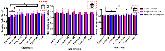 Figure 1 shows the effect of tasks and age on running cycle. The red box represents the main effect of task, and the running cycle of cognitive and obstacle crossing tasks was greater than the normalized running (p < 0.05). The stance phase percentage of cognitive tasks was higher than normalized and obstacle crossing tasks (p < 0.05), whereas the swing phase percentage was lower than normalized and obstacle crossing tasks (p < 0.05). Age characteristics of the running cycle time showed a nonlinear increasing trend under normalized and cognitive tasks, with significant differences observed in the 3-year-old, 5-year-old, and 8-year-old groups. In obstacle crossing tasks, the swing phase percentage showed a nonlinear increasing trend with age, and the 5-year-old, 7-year-old, and 8-year-old groups were larger than the 3-year-old group (p < 0.05).