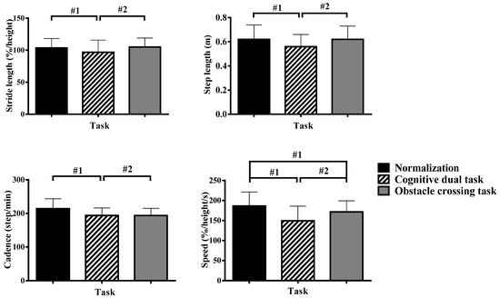 Running spatial characteristics of different tasks. Notes: #1, compares with the normalization group; #2, compares with the cognitive dual-task (p < 0.05).