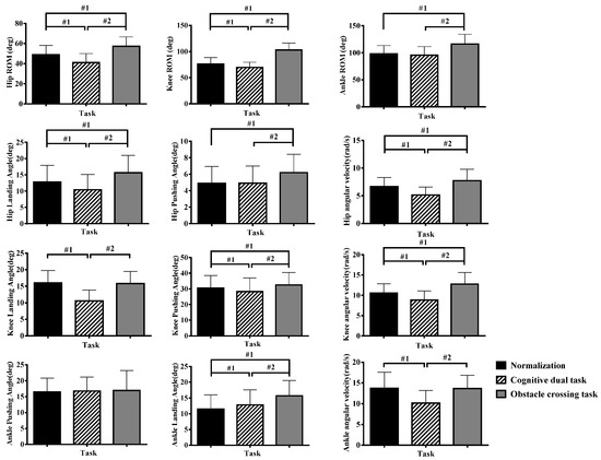 Figure 3 shows the main effect of task on lower limb joint angle. From the overall characteristics, the joint angle of cognitive tasks showed the lowest value (p < 0.05), whereas the obstacle crossing tasks showed the highest value (p < 0.05).