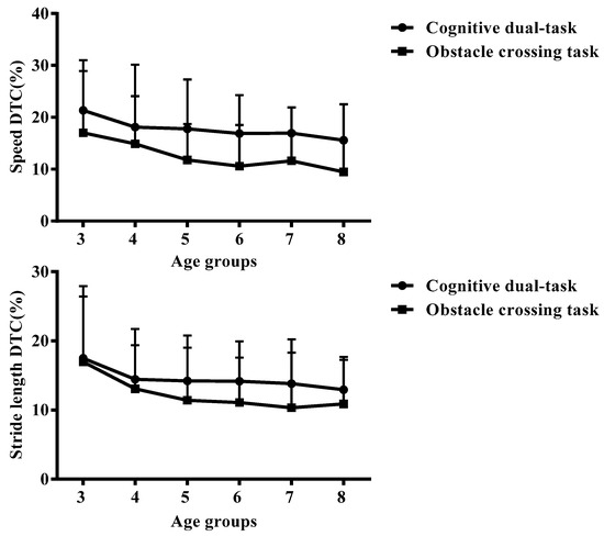 The task cost is the main effect of task and age; there was no interaction effect. Table 5 shows multiple comparison results. Figure 4 shows the age trend of dual-task costs, with children’s speed and stride DTC decreasing with age. The cognitive task costs of running speed and stride length were both higher than obstacle crossing tasks (p < 0.05). In obstacle crossing tasks, the speed cost of the 8-year-old group was lower than the 3-year-old group (p < 0.05), whereas the stride length cost of the 7-year-old group was lower than the 3-year-old group (p < 0.05).