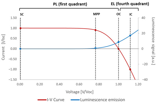 Figure 1 displays a typical illuminated current–voltage curve of a PV cell or module and the variation in luminescence signal intensity depending on the working point of the curve. The PL effect is observed when the cell or module is operating in the first quadrant of the curve. In this scenario, the device functions as a generator, and sunlight produces the PL effect. This effect is null in short-circuit (SC) conditions and exponentially increases with the operational voltage. At the maximum power point (MPP), the signal is almost null, and the maximum PL signal is observed when the PV device is in open-circuit (OC) conditions. On the other hand, the EL effect requires a higher voltage than the open-circuit (OC) voltage, resulting in current injection (CI). In this case, the device operates in the fourth quadrant of the curve as a load, and PL and EL signals are added (only if the PV device is under illumination). This results in a higher luminescence intensity, which also increases with the voltage.