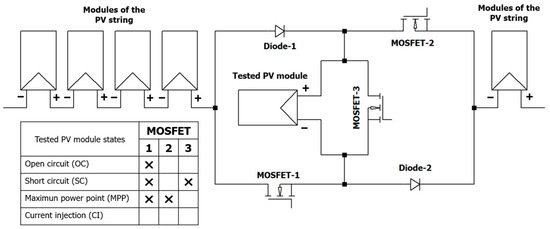 Topology of the electronic board development: MOSFETs that must be conducting to achieve OC, SC, MPP, and CI in the tested PV module are indicated with crosses in the complementary truth table.