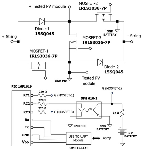 The simulation process was followed by the construction of a prototype board for validation in a real PV power plant. All the components used in the construction of the board and the designed circuit can be seen in Figure 3. Note that MOSFET-2 has its source connected to a different node than MOSFET-1 and MOSFET-3. Therefore, it cannot be directly controlled by one of the microcontroller pins. Instead, an external 5 V battery and an optocoupler have been implemented to control this transistor. The microcontroller has been programmed to receive commands through its serial port to set the module in different required states (OC, SC, MPP, and CI).