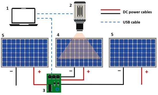 Future work will involve addressing several issues. Firstly, a power supply system will be developed to feed the board using the solar module voltage. This will eliminate the need for an external voltage supply for the board to function. Secondly, software improvements will enable the integration of a synchronization system between the board and the camera, as well as the processing algorithm. This integration will allow for the processing of pictures while they are being captured. Therefore, it will be possible to evaluate how many pictures and cycles are needed to achieve a minimum standard of quality. Finally, a communications module will be integrated into the board to send commands to the board through the DC power cable of the plant from the inverter. As it is expected that each module will have one electronic board, an identification system will also be implemented in order to send commands to selected modules. This improvement will enhance efficiency and throughput, resulting in cost reduction. Moreover, they also facilitate the integration of image acquisition with UAVs. Consequently, operators are not required, and measurements can be automatically conducted, saving both time and money.