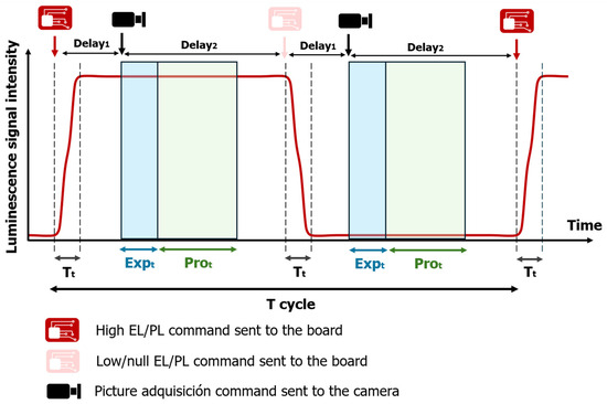 To properly synchronize the image acquisition, some issues must be considered. One cycle of pictures acquisition is shown in Figure 5. On one hand, it must be considered that there is a transient time (Tt) between when a command is sent to the board and when the tested module changes its state. Therefore, a delay time (delay1) should be added between the time when the command is sent to the board and when the command is sent to the camera to acquire a picture. This transient period has been measured, and in the current setup, it is always under 0.1 ms. On the other hand, it is necessary that the tested module remains in a high or null luminescence state during the exposure time (Expt) set in the camera to achieve a good measurement. Therefore, a delay time (delay2) should be considered to add between the time when the command is sent to the camera and the time when a command is sent to the board in order to change its state. The camera also requires a certain time to process the picture (Prot), so the time required to acquire a picture (Expt + Prot) must be lower than the time between when two consecutive commands are sent to the camera. As Figure 5 shows, during one cycle, two pictures are acquired; one corresponds to a high EL/PL signal and the other corresponds to null/low EL/PL signal. In the presented work, the implemented camera requires 17 ms to process the picture. The period of the cycle (T cycle) of the current setup is around 250 ms, so a total of 8 pictures are taken per second. After the measurement process, the script set MPP in the board, so the string recovers its normal performance.