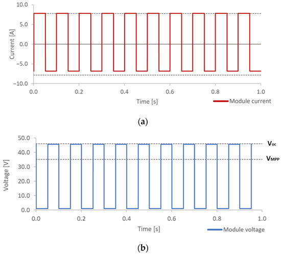 On the one hand, for EL imaging acquisition, the electronic board must repetitively change the state of the tested module between CI and MPP. The evolution of the current module while it happens is shown in the first plot of Figure 6a. It is possible to see how the current changes between the MPP current, which is positive, and a negative current, which means CI into the module and therefore a high EL signal.