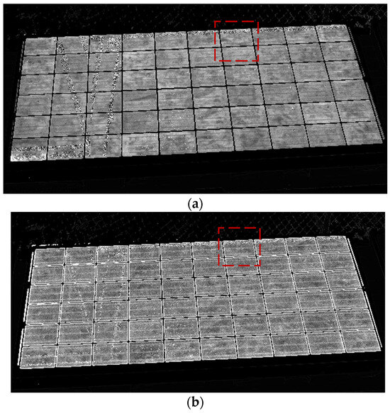 Figure 7 displays both EL (Figure 7a) and PL (Figure 7b) final pictures after processing of one PV module. It can be observed in both pictures that the luminescence signal intensity is uniformly spread across all the cells of the modules, indicating good health and performance of the module. The state of this module has also been measured through its current–voltage curve, which does not reveal any major failures. The parameters of the current–voltage curve, including VOC, VMPP, ISC, IMPP, and Power, are displayed in Table 2, showing a degradation, especially in the current, which can be considered normal as the module has been in operation for a few years. In this case, the luminescence pictures allow us to understand that the module degradation measured in the current–voltage curve is caused by uniform degradation and is not caused by major faults in certain solar cells.