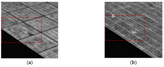 Figure 8 displays closer EL and PL pictures of the same module, revealing a cell with a minor fault (that cell is surrounded by a red square in Figure 7 and Figure 8). It is possible to see how a crack has led to a small part of the solar cell area not being electrically connected. Therefore, the EL signal is null, as can be seen in Figure 8a. However, the PL signal in this area is high in Figure 8b as this part of the cell, although not connected with the rest of the cell and therefore current can be extracted or injected, the quality of the material is still good. In this way, EL and PL pictures provide complementary information on the module performance.