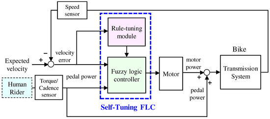 As mentioned above, several FLC-based approaches have been presented for controlling power-assisted bicycles. However, in most of the approaches, the fuzzy rule bases are fixed and not adaptive to environmental changes, such as different riders and roads. In this paper, a modified FLC, named self-tuning FLC (STFLC), is proposed for power-assisted bicycles. In the presented scheme, in addition to a typical FLC, a rule-tuning module is added to dynamically adjust the rule base during fuzzy inference processes.