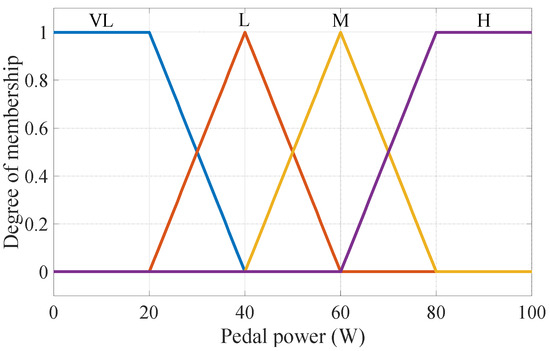 In the fuzzification stage, the inputs are formulated as membership functions. Since the pedal power of the general public is between 0 and 100 W [18], this study takes 0 to 100 W as the range of the membership function. The linguistic values are “Very Low, Low, Medium, High”, and the abbreviations are expressed, respectively, as “VL, L, M, H”; the pedal power membership function is shown in Figure 3.