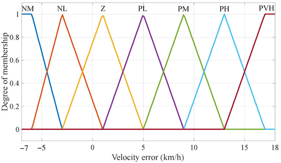 To ensure a comfortable riding experience, it is crucial to maintain the bicycle at a predefined velocity. Based on findings from the literature [4], urban riding typically involves an average and comfortable speed of approximately 18 km/h, which serves as the expected velocity in this study. Moreover, in numerous countries, road regulations dictate that the assist power for E-bikes should be reduced if the bicycle velocity surpasses 25 km/h. Hence, our design encompasses a bicycle velocity range from 0 to 25 km/h, resulting in an error range spanning from −7 to 18 km/h. The linguistic values are “Negative Medium, Negative Low, Zero, Positive Low, Positive Medium, Positive High, Positive Very High”, and the abbreviations are, respectively, expressed as “NM, NL, Z, PL, PM, PH, PVH”. The velocity error membership function is shown in Figure 4.