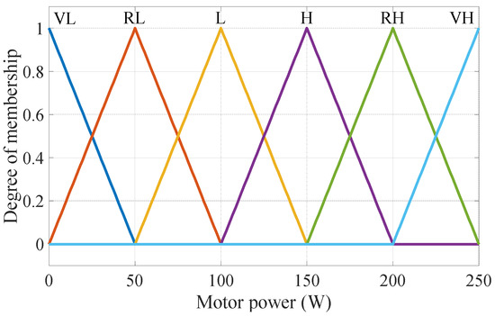 This paper uses a 36 V/250 W electric motor. Therefore, the membership function of the motor power output has a minimum value of 0 W and a maximum of 250 W. The linguistic values are “Very Low, Rather Low, Low, High, Rather High, Very High”, and the abbreviations are, respectively, expressed as “VL, RL, L, H, RH, VH”. The motor power membership function is shown in Figure 5.