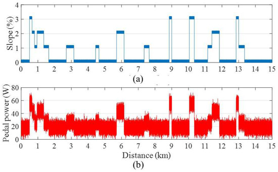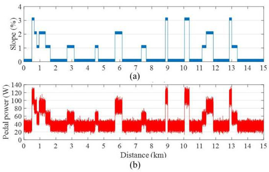During the experimental phase, the road profile was simulated by incorporating ramps with varying slopes. Specifically, for a 15 km riding distance in an urban area, Figure 6a,b present the planned road profile and pedal power profile of a powerful rider (0–140 W), respectively. The road slope ranges from 0% to 3%, with an additional white Gaussian noise of 0.2% standard deviation. The pedal powers corresponding to different slopes were modeled as a Gaussian distribution [12].