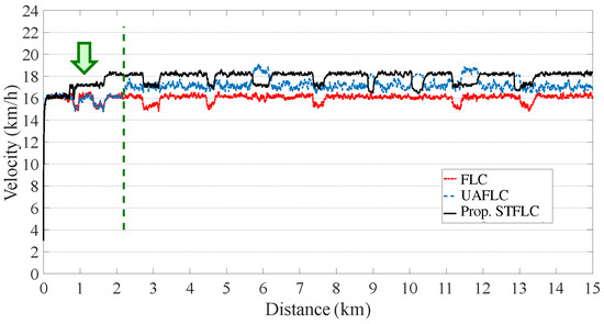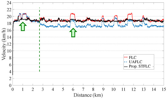 As illustrated in Figure 7, during the initial stage, the velocity curves of the three controllers display similarity as they utilize the typical FLC, which serves as the default option for an ordinary rider. However, after covering a distance of approximately 500 m, the proposed STFLC adjusts its rules based on velocity errors using fuzzy logic for computing the assisted motor power. On the contrary, the UAFLC requires a 2 km adaptation period to determine the adaptive pedal power range for a powerful rider.