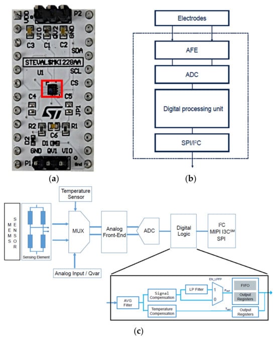 (a) QVAR evaluation board details: the sensor is highlighted by the red box. (b) High-level QVAR block diagram and electrodes. (c) Low-level functional block diagram of the QVAR sensor.