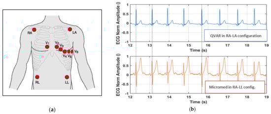 (a) Electrode placement for a 12-lead ECG configuration, with electrodes on the right arm (RA), left arm (LA), left leg (LL), right leg (RL), and chest (electrodes V1 to V6). (b) Normalized ECG traces acquired simultaneously by the QVAR and Micromed systems, from RA-LA and RA-LL configurations, respectively. Dashed lines highlight the R peaks.