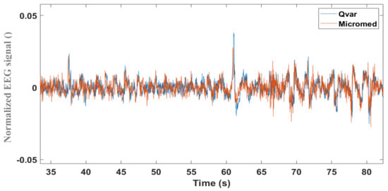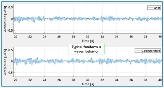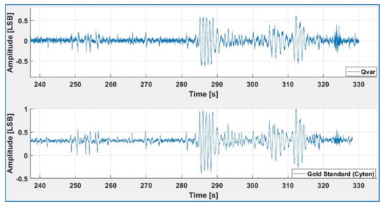 We acquired α-wave and β-wave EEGs using QVAR sensors and compared the results with those of a gold standard (the Cyton BCI). To ensure comparability, the electrodes of the Cyton BCI and QVAR sensors were always positioned as closely as possible. Placing gold cup electrodes with a conductive paste at occipital sites O1 and O2 of the International 10–20 System Standard [40], and then filtering within the 8–13 Hz band, maximized the specific contribution of α waves. Figure 4 displays the normalized filtered traces of QVAR and the gold standard during a test where the subject remained relaxed, with eyes closed. The typical fusiform pattern is distinctly visible, with approximately ten peaks in each fuse. Once again, the agreement of the two traces is excellent.