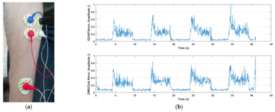 Picture of the patch electrodes positioned on the flexor carpi radialis (a). The traces collected by the QVAR (top) and EMGClick (bottom) devices are displayed by the side (b).