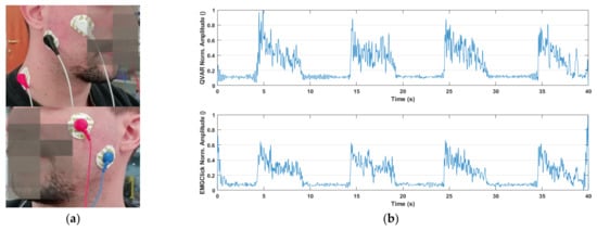 (a) Picture of the patch electrodes positioned on the masseter. (b) The traces collected by the QVAR (top) and EMGClick (bottom) devices are displayed by the side.