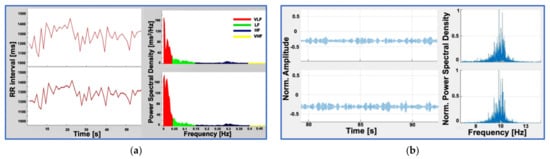 (a) RR trait duration and power spectral density obtained with QVAR (top) and the gold standard (bottom); (b) α-wave EEG and normalized power spectral density recorded by QVAR (top) and the gold standard (bottom).