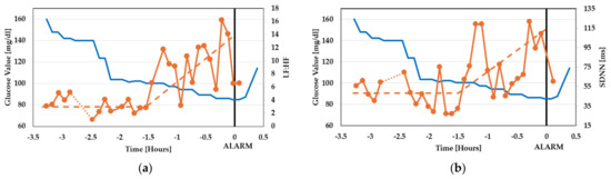 Values of the ECG parameters ((a) LF:HF, (b) SDNN) before the GM alarm at t = 0 (orange curve with symbols). In the same figure, the glucose data recorded by the GM are also drawn as solid blue lines. The dashed lines indicate the trend of the studied parameters.