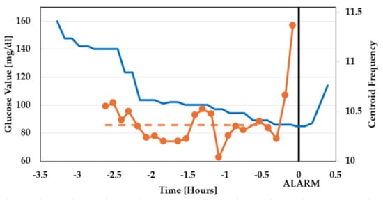 As one can see, the ECG underwent a slow and progressive variation when the glucose decreased below the value of 100 mg/dL, long before the alarm at t = 0 (approximately 90 min before), while the α-wave EEG exhibited a sudden variation only 15 min before the alarm.