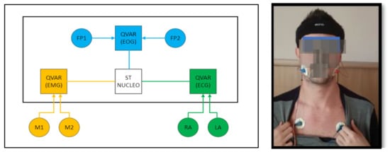 The electrodes on the masseter (M1, M2) for the EMG and the electrodes on the chest (RA, LA) for the ECG are shown in the photograph by the side. The electrodes on the frontal regions (Fp1, Fp2) for the EOG are inside the headband, in contact with the forehead skin. The ECG provides a comprehensive overview of the heart rate, which could also be detected through a PPG sensor in order to reduce wiring, despite increased power consumption. The QVAR sensors transmit data to the Nucleo through the I2C standard. Each QVAR acquires the corresponding biopotential at a sampling frequency of 240 Hz, utilizing a two-electrode configuration. The reference voltage for QVAR sensors is provided by the on-board circuitry, avoiding the third reference electrode.