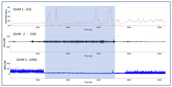 Tests were performed on a control subject over consecutive nights. A result of main interest is reported in Figure 12. This figure represents a specific 45-min timeframe during a night, which started approximately 3 h after the subject fell asleep. The graphical representation reports the traces of the three biopotentials as a function of time, covering the interval from 3:10 to 3:55 a.m. (in these figures, the time scale has an internal origin). When considering the HR derived from the trace recorded by QVAR 1, initially it remained below 55 bpm in the first minutes; then, at 3:28, the HR exhibited wide variability, with bursts reaching up to 80 bpm. This interval of pronounced HRV stopped at 3:45, after which the HR reverted to values below 55 bpm. The 17-min interval between 3:28 and 3:45 is highlighted with a grey shadow. Concerning the eye activity detected by QVAR 2, the EOG signal remained close to zero for the initial 8 min, indicating an absence of eye movements. Then, around 3:28, there was a substantial increase in eye activity, which stopped at 3:45. Lastly, regarding the masseter tone detected by QVAR 3, in the shadowed interval, the masseter manifested total atonia, while in other intervals a residual constant contraction was present. The simultaneous occurrence of all three patterns was an extraordinary event, observable only two times throughout the night of testing, with durations of 17 and 15 min, respectively. On the other hand, in other intervals of variable durations, frequent changes in the individual signals under consideration occurred. In particular, QVAR 1 often recorded pronounced variability in HR, underscoring the limitations of CST in accurately analyzing sleep patterns.