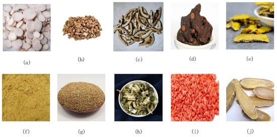 Sample of the Chinese herbal medicine dataset: (a) Radix paeoniae; (b) Radix stemonae; (c) Fructus aurantia tablets; (d) Polygonatum; (e) turmeric; (f) Pollen typhae; (g) Cnidium monnieri; (h) motherwort; (i) Chinese wolfberry; (j) curcuma.