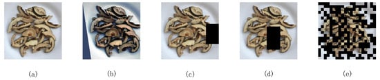 Data augmentation: (a) original image; (b) random augmentation strategy; (c) cutout strategy; (d) random erasing strategy; (e) hide-and-seek strategy.