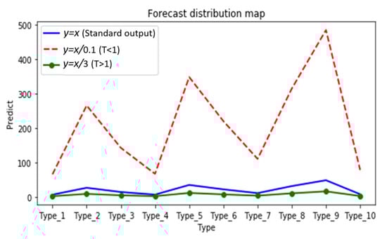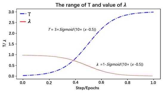 Figure 8. The distribution of T/λ. - Selection of λ: In knowledge distillation, when the student model is at distinct training phases, the combined weights of the teacher model and the true label are likewise diverse. In the early stage of training, transfer learning and real labels are mainly mixed for learning and fitting, which guarantees that the high accuracy based on the pretrained model can be acquired in the whole model training. Nevertheless, with the deepening of the training epochs, since the student model has reached a successful convergence situation through self-study, the accuracy cannot be further improved. Therefore, by increasing the proportion of the teacher model on and on, the student model learns the dark knowledge distribution from the teacher model prediction distribution, thereby improving the model performance. The change in λ is shown in Figure 8 and Formula (3), where x indicates the training times. By this function, λ decreases in an S-curve with the deepening of the training process.