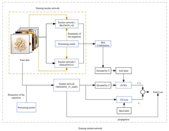 - During the training of the student network, the loss value employed for updating parameter weights during backpropagation is divided into two components. One part represents the cross-entropy loss computed on the true labels of the training dataset. The other part corresponds to the loss calculated on the soft output of the teacher network. Ultimately, these two losses are weighted and combined to generate the overall loss, which is then applied to the training of the student network model [25,26,27,28].