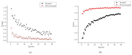 Comparison of the effects of pretrained models on model training: (a) loss value figure; (b) accurate figure.