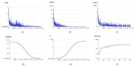Metrics of mobileNet_v3_Small_DTSD changes in training process:(a) total loss; (b) soft loss; (c) hard loss; (d) λ value change; (e) T value change; (f) accuracy change curve.