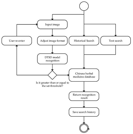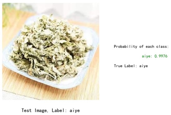 To validate the practical application of the model, we developed a mobile recognition app based on it. As shown in Figure 13, the app’s main features include an input image, a historical search, and text search capabilities. After selecting the image search function, users can upload relevant images of Chinese herbs. The app processes these images through cropping and utilizes the corresponding model and a backend database of Chinese herbs to return information about the herb. The example result, shown in Figure 14, indicates that the tested image has been classified as “aiye” with a matching true label. The probability of correct classification is 99.76%. Practical validation confirmed that the MobileNet_v3_DTSD model, trained using the dual-teacher adaptive-decay approach based on improved knowledge distillation and data augmentation, maintained its lightweight and rapid processing characteristics while also exhibiting robustness and high accuracy. Future efforts will focus on further optimizing these improvements to enhance the model’s performance in real-life applications.